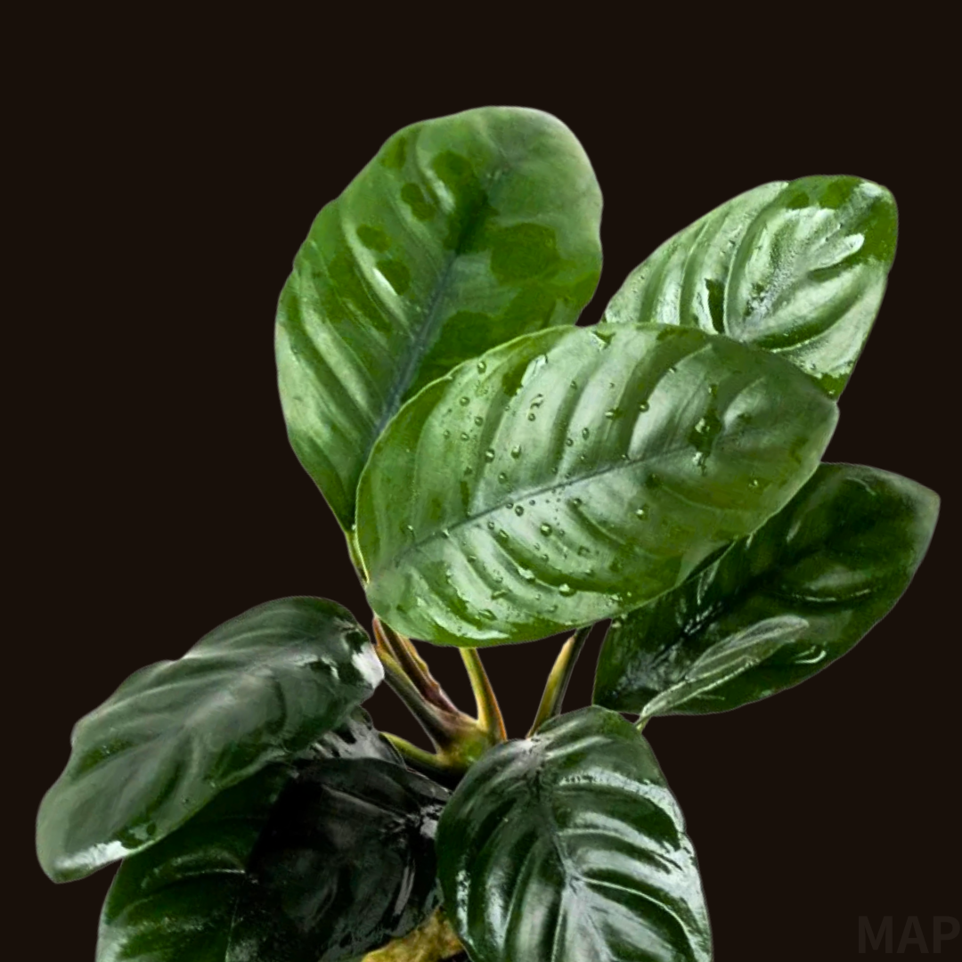 アヌビアス・コーヒーフォリアは、西アフリカ原産のアヌビアス・バルテリーを基に作出された改良品種です。その最大の特徴は、コーヒーノキの葉を彷彿とさせる、深く波打つ凹凸のある葉の表面にあります。新芽は赤褐色を帯びて展開し、成長するにつれて深緑色へと変化する色彩のグラデーションも大きな魅力です。他のアヌビアス属と同様に非常に強健で、育成は容易ですが、その独特の質感がレイアウトに深みと野性的な雰囲気を与え、中景草として優れた存在感を放ちます。2010年には独立した変種(Anubias barteri var. coffeifólia)として正式に記載されており、単なる栽培品種以上の、安定した遺伝的特徴を持つことが認められています。 Anubias coffeefolia is a cultivated variety derived from Anubias barteri, native to West Africa. Its most prominent feature is the deeply undulating and textured surface of its leaves, reminiscent of a coffee plant’s leaves. New shoots emerge with a reddish-brown hue and transition to a deep green as they mature, creating an attractive color gradient. Like other Anubias species, it is extremely robust and easy to grow. Its unique texture adds depth and a wild atmosphere to layouts, making it an excellent midground plant. In 2010, it was formally described as a distinct variety (Anubias barteri var. coffeifólia), recognizing its stable genetic characteristics beyond just being a cultivar.