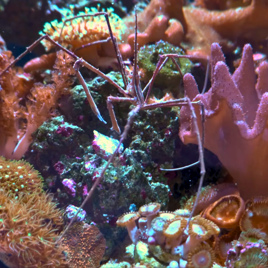 ライブロックで複雑な隠れ家を作りますが、長い脚が引っかからないよう適度な空間(クリアランス)を確保してください。オーバーハング(岩の庇)の下を好みます。Provide complex hiding spots with live rock, but ensure enough clearance for their long legs. They prefer resting under overhangs.