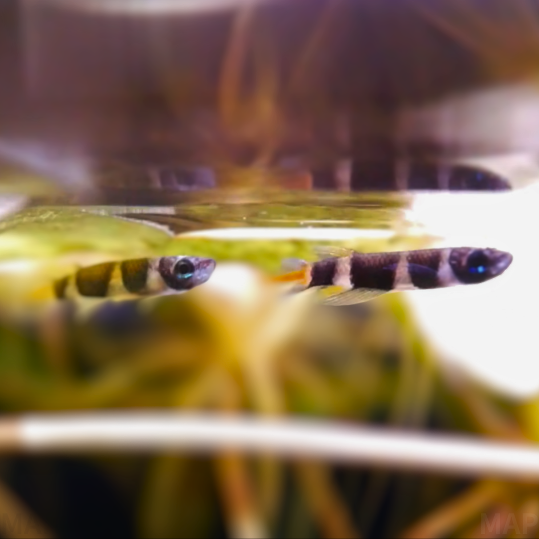エピプラティス・アニュラータスは、西アフリカの穏やかな流れに暮らす、小さな宝石のような卵生メダカです。道化師(クラウン)の衣装を思わせる鮮やかな縞模様と、オスの尾ビレに見られるロケットの炎のような色彩から「クラウンキリー」や「ロケット・キリー」の愛称で親しまれています。その小型の体は、ナノアクアリウムや水草水槽に絶妙なアクセントを加え、水面近くを優雅に漂う姿は、多くの愛好家を魅了してやみません。Epiplatys annulatus is a small, jewel-like killifish native to the gentle streams of West Africa. It is affectionately known as the “Clown Killie” or “Rocket Killie,” names inspired by its vibrant striped pattern reminiscent of a clown’s costume and the rocket-flame-like coloration of the male’s tail fin. Its diminutive size adds a perfect accent to nano aquariums and planted tanks, and its graceful presence near the water’s surface captivates many enthusiasts.
