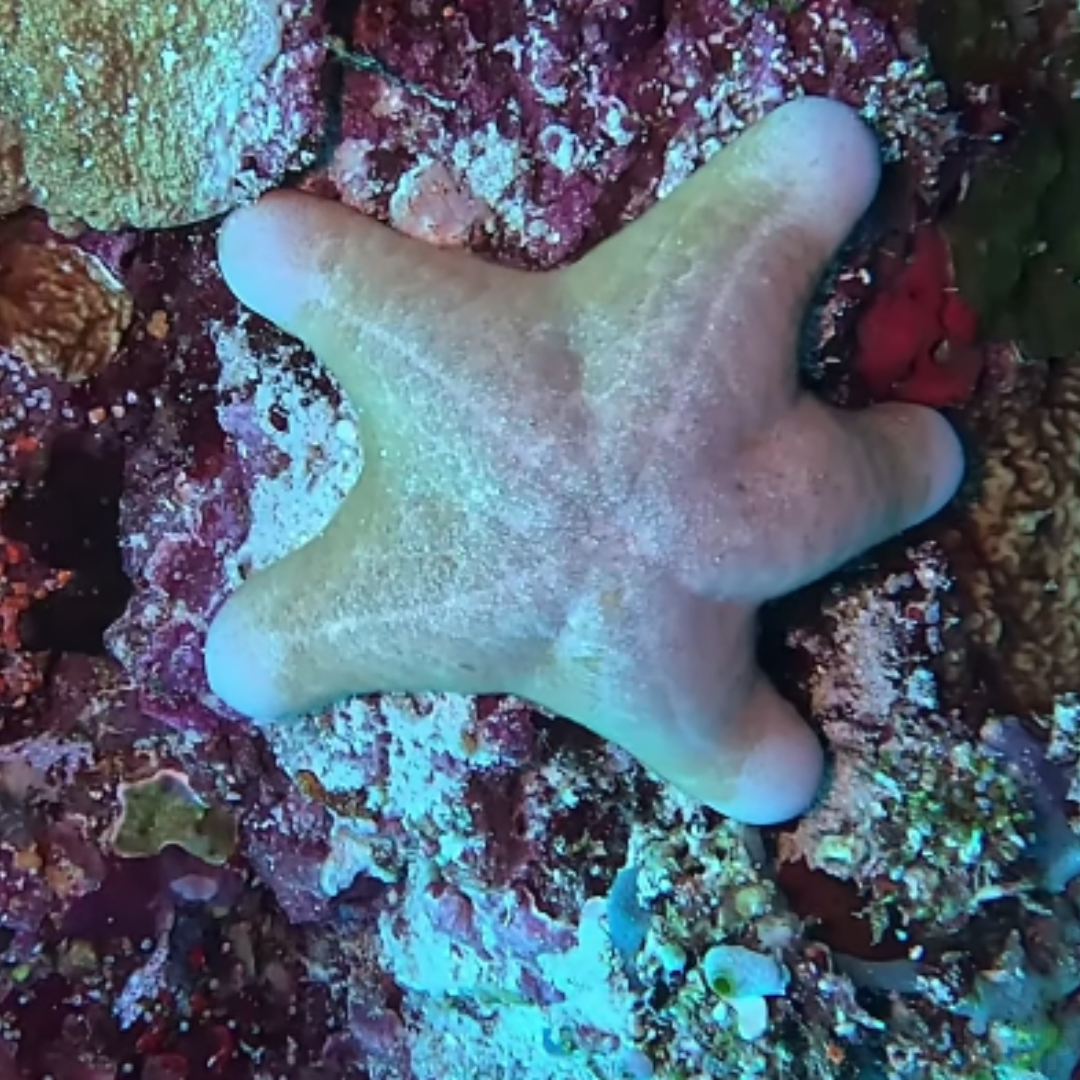 まるで分厚い皮の手袋が海底に落ちているかのような、独特の存在感を放つ大型のヒトデ、それがカワテブクロです。そのふっくらとした肉厚な体と、滑らかでありながらゴムのような弾力を持つ質感は、一度見たら忘れられないインパクトを持っています。淡いピンク色を基調としつつ、個体によってはオレンジやグレーなどの色彩変異も見られ、サンゴ礁の海中景観にユニークな彩りを添えています。一見すると愛嬌のあるおとなしい生き物に見えますが、実はサンゴ礁生態系におけるたくましい日和見捕食者としての側面も持ち合わせており、その生態を知れば知るほど奥深い魅力に気づかされるでしょう。The Granulated Sea Star, known in Japan as “Kawatebukuro” (Leather Glove), is a large starfish with a unique presence, resembling a thick leather glove resting on the seabed. Its plump, fleshy body and smooth yet rubbery texture make a lasting impression. While typically pale pink, color variations such as orange and gray exist, adding a unique touch to the coral reef landscape. Although it appears charming and docile at first glance, it is actually a robust opportunistic predator in the coral reef ecosystem, and the more you learn about its ecology, the more you will appreciate its profound appeal.