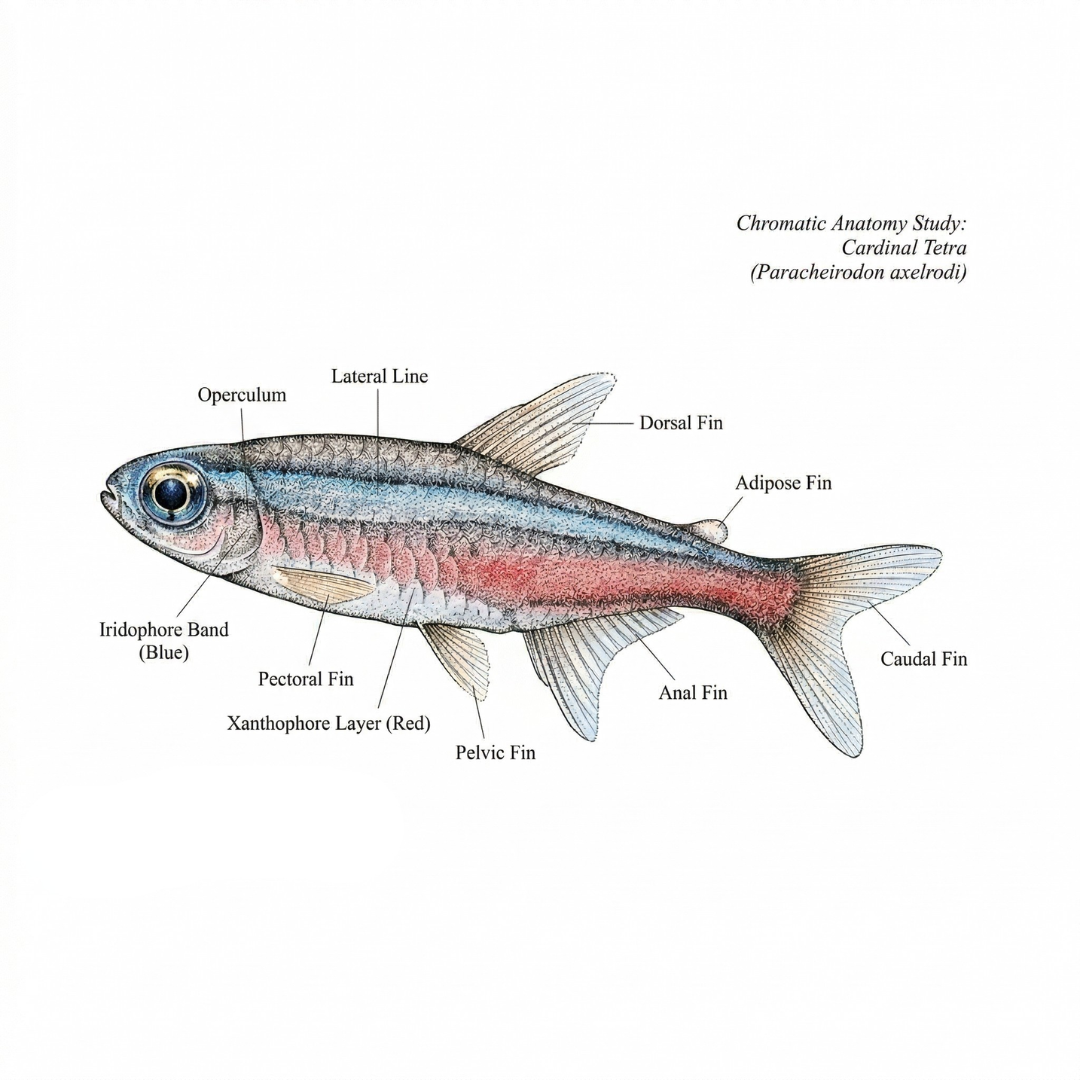 カージナルテトラの鮮烈な輝きは、色素による色ではなく、光の干渉を利用した構造色です。真皮にある虹色素胞の中のグアニン結晶が、特定の波長の光を反射しています。