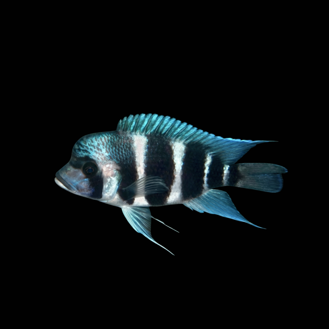 キフォティラピア・ギベローサ(Cyphotilapia gibberosa)は、アフリカ東部の巨大な古代湖、タンガニイカ湖の南半分に固有分布するシクリッドです。かつては約1世紀にわたりキフォティラピア・フロントーサと同一の種として扱われてきましたが、2003年に日本の研究者らによる詳細な形態調査の結果、別種として正式に記載されました。水深15メートルから最大120メートルという、淡水魚としては極めて珍しい深水域を主な生息地としており、高水圧かつ安定した環境に適応した、穏やかで知性的な性格を持っています。体側には5本の太い垂直バンドが入り、成長したオスは前頭部に脂肪が蓄積された立派な肉瘤を発達させます。その威風堂々とした姿から、アクアリウムにおける「湖の王者」として、世界中の愛好家から絶大な敬意と人気を集めています。Cyphotilapia gibberosa is a large cichlid endemic to the southern half of Lake Tanganyika, a vast ancient lake in East Africa. For nearly a century, it was treated as the same species as C. frontosa, but in 2003, it was officially described as a distinct species following detailed morphological research by Japanese scientists. Inhabiting deep waters ranging from 15 to 120 meters—a rare habitat for freshwater fish—it possesses a calm and intelligent temperament adapted to high-pressure environments. It features five bold vertical bands on its body, and mature males develop a magnificent nuchal hump. Known as the “King of the Lake,” it commands immense respect and popularity among aquarists worldwide.