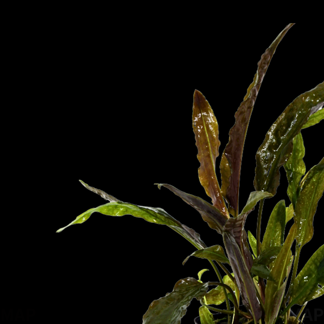 日本に初めて紹介された際、類似種のアポノゲティフォリアと名前が入れ替わって流通していた歴史がある。環境が安定した水槽では何年も成長し続けるため「長期維持の象徴」とも言われる。水中葉とは異なる光沢のある硬い葉を展開する水上栽培も可能で、条件が良ければ赤紫色の仏炎苞を咲かせることがある。When first introduced to Japan, it was historically circulated under the name of a similar species, C. aponogetifolia, and vice versa. It is sometimes called a “symbol of a long-term stable tank” because it can continue to grow for years in a stable environment. Emersed cultivation is also possible, producing glossy, hard leaves different from the submersed form, and may even bloom with a reddish-purple spathe under good conditions.