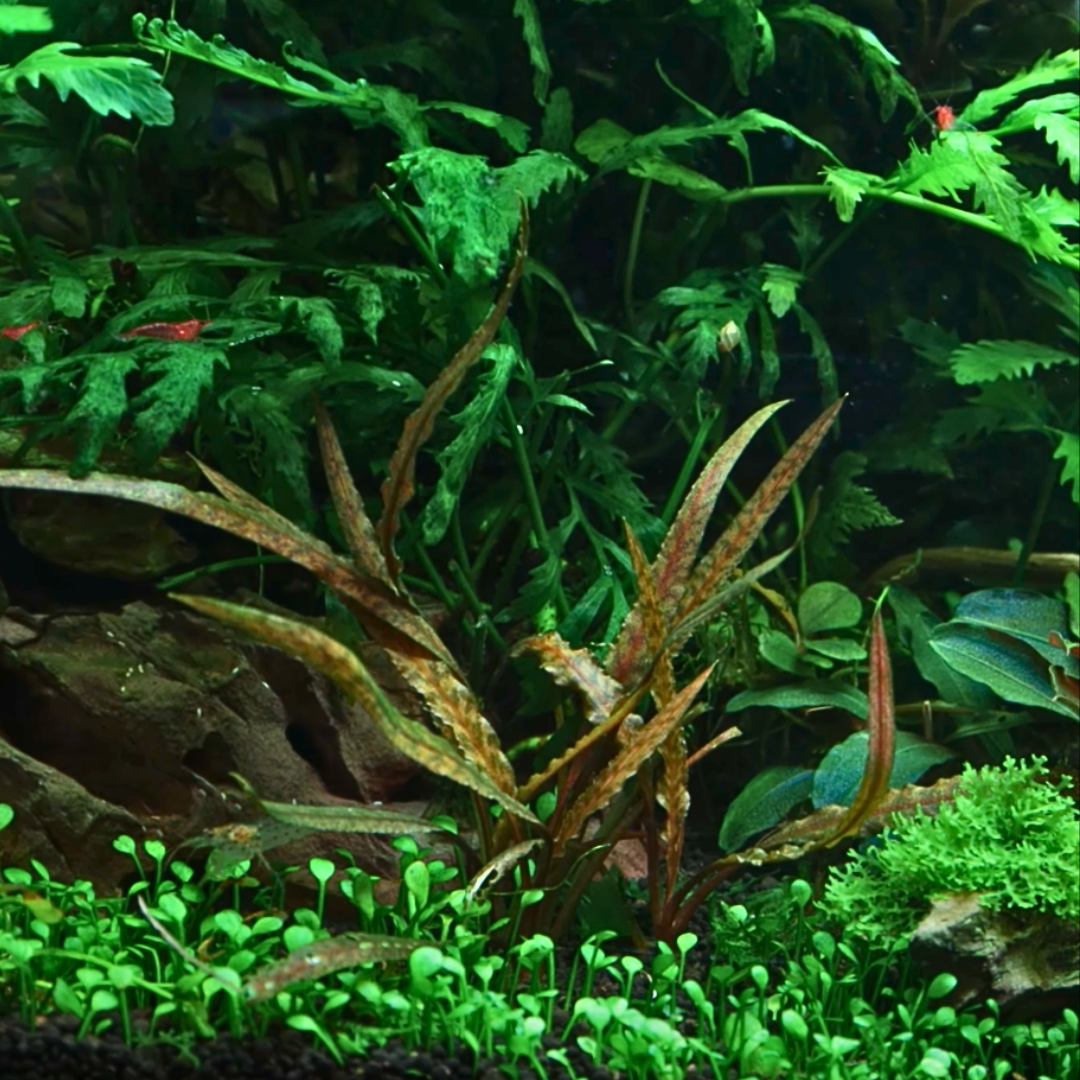 クリプトコリネ アルビダ ‘ブラウン’は、その名の通り赤褐色から暗褐色の細長い葉が特徴的な美しい水草です。葉には焦げ茶色の不規則な斑模様が入り、縁は優雅に波打ちます。レイアウトの中景でアクセントとして用いられることが多く、水景に深みと落ち着きを与えます。環境の変化に敏感で、導入時に葉が溶ける「クリプトメルティング」現象を起こすことがありますが、一度環境に馴染めば非常に丈夫で、育成は比較的容易です。学術的にはクリプトコリネ・クリスパチュラの一変種とされており、その背景を知ることで育成のヒントが得られます。 Cryptocoryne albida ‘Brown’ is a beautiful aquatic plant characterized by its reddish-brown to dark brown slender leaves, as its name suggests. The leaves feature irregular dark brown mottled patterns and elegantly undulating margins. It is often used as an accent in the midground of layouts, adding depth and a sense of calm to the aquascape. While sensitive to environmental changes and known to experience “Crypt melt” (leaves melting upon introduction), it becomes very hardy once acclimated and is relatively easy to grow. Scientifically, it is considered a variety of Cryptocoryne crispatula, and understanding this background provides valuable cultivation insights.