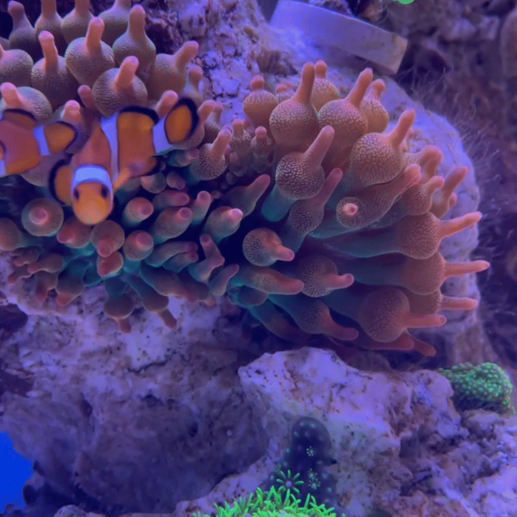 サンゴイソギンチャクは、クマノミが共生する姿で広く知られる、海水アクアリウムで最も象徴的なイソギンチャクの一つです。鮮やかな緑色や赤色など多彩なカラーバリエーションを持ち、環境によって触手の先端が丸く膨らむ「タマイタダキイソギンチャク」の姿になることでも人気があります。体内の褐虫藻による光合成でエネルギーを得ており、飼育には強い照明と安定した水質が不可欠です。 The Bubble-tip anemone is one of the most iconic anemones in marine aquariums, widely known for its symbiotic relationship with clownfish. It boasts various color variations, such as vibrant green and red, and is also popular for its appearance as the “Bubble-tip” form, where the tentacle tips swell into bulbs depending on the environment. It derives energy from the photosynthesis of its internal zooxanthellae, making strong lighting and stable water quality essential for its care.