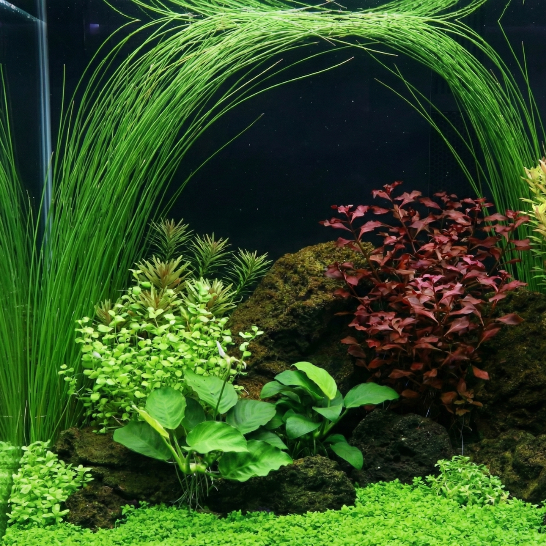 育成において最も大切なのは、ハサミで一律にカットするのではなく、手間を惜しまず一本一本「間引き」を行うことです。この丁寧なメンテナンスこそが、プロフェッショナルな水景の美しさを支えています。水流にそよぐ緑のカーテンを作り上げ、水槽の中に広がる小さな大自然を楽しんでください。The most important aspect of cultivation is not to cut uniformly with scissors, but to “thin out” strand by strand without sparing effort. This careful maintenance underpins the beauty of professional aquascapes. Create a green curtain swaying in the current and enjoy the miniature nature spreading within your aquarium.