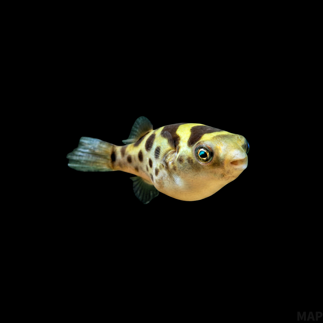 トパーズパッファーは、その名の通り宝石のトパーズを思わせるリッチな黄金色の体色と、背中に入る美しい黒色の鞍(サドル)模様が特徴的な中型フグです。日本では「インドマミズフグ」という流通名で販売されることがありますが、その名に反して、実際には成長に伴い汽水から海水環境を必要とする広塩性魚類です。愛嬌のある顔つきと、光の加減で金属光沢を放つ美しい体は観賞魚として非常に魅力的ですが、適切な塩分管理と広めの水槽を用意することが、10年以上の長い付き合いを実現するための鍵となります。The Topaz Puffer, true to its name, is a medium-sized pufferfish characterized by a rich golden body color reminiscent of topaz gems and a beautiful black saddle pattern on its back. In Japan, it is sometimes sold under the trade name “Indian Freshwater Puffer,” but contrary to this name, it is actually a euryhaline fish that requires a brackish to marine environment as it grows. While their charming faces and bodies that shine with metallic luster under light are very attractive, providing proper salinity management and a spacious tank is the key to enjoying their company for over 10 years.