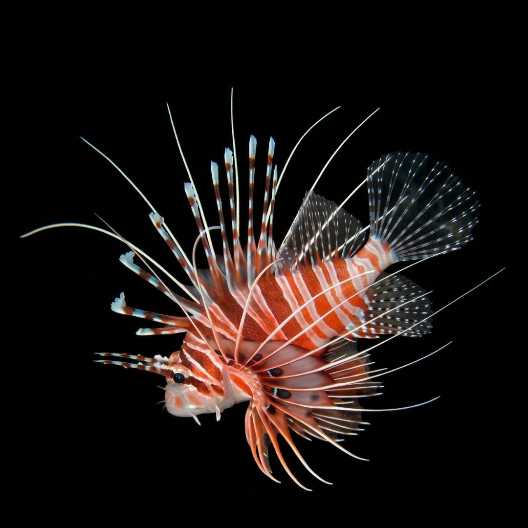 ネッタイミノカサゴは、その優雅な鰭の動き一つをとっても、数千万年の進化がたどり着いた一つの完成形と言えるでしょう。夜の静寂の中で、仲間に合図を送りながら精密な狩りを行う彼らの姿は、私たちが抱く「魚は本能だけで動く」という固定観念を鮮やかに覆してくれます。その美しさの背後には強力な毒と鋭い捕食本能が隠されていますが、それこそが野生の厳しさと気高さの象徴でもあります。 The Spotfin Lionfish, with every graceful movement of its fins, represents an evolutionary pinnacle reached over tens of millions of years. Their ability to conduct precise, coordinated hunts with partners in the silence of the night shatters the stereotype that fish act solely on instinct. While their beauty hides a potent venom and sharp predatory drive, these features symbolize the raw majesty and rigor of the natural world.