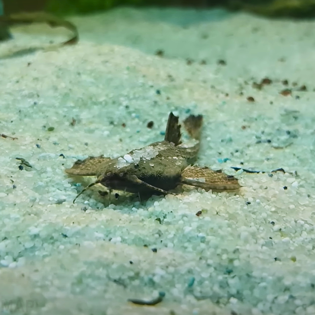 バンジョーキャットは、南米アマゾン川流域に生息するアスプレド科の小型ナマズです。その名の通り、平たい頭部と細長い尾部が弦楽器のバンジョーに似ていることから名付けられました。日中は砂や落ち葉の中に完全に潜って身を隠し、夜になると活動を開始する夜行性です。枯れ葉に擬態したかのような体色を持ち、非常に温和な性格で他の魚を攻撃することはありません。そのユニークな姿と生態から、静かな水槽を好む愛好家の間で根強い人気を誇ります。 The Banjo Catfish is a small catfish from the Aspredinidae family, native to the Amazon River basin in South America. It gets its name from its distinctive shape—a wide, flat head and a slender tail section that resemble a banjo. It is a nocturnal fish that spends its days completely buried in sand or leaf litter, becoming active at night. With coloration that mimics a dead leaf and a very peaceful temperament, it does not attack other fish. Its unique appearance and behavior have made it a long-standing favorite among aquarists who appreciate a tranquil aquarium.