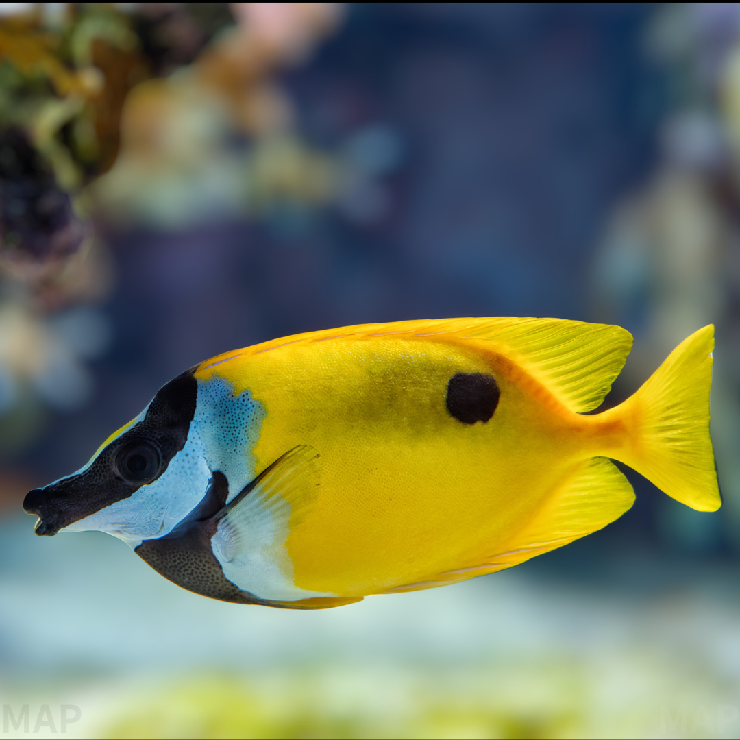 ヒフキアイゴは、西太平洋のサンゴ礁に生息するアイゴ科の魚です。前方に突出した吻が日本の伝統的な面「ひょっとこ」を連想させることから、その名が付けられました。鮮やかな黄色の体と、背中の後方にある大きな黒い斑点が最大の特徴で、この斑点の有無で近縁種のフォックスフェイスと区別されます。主に藻類を食べる植物食性の強い雑食性で、サンゴ礁の藻類の繁茂を抑える重要な役割を担っています。飼育下では比較的丈夫ですが、背ビレ、腹ビレ、尻ビレに強力な毒棘を持つため、取り扱いには最大限の注意が必要です。 The Blotched Foxface is a rabbitfish found in the coral reefs of the Western Pacific. Its Japanese name “Hifuki-aigo” comes from its protruding snout, which resembles the traditional Japanese “Hyottoko” mask. Its most distinct features are its bright yellow body and a large black spot on the upper rear of its body, which distinguishes it from the closely related Foxface. It is a primarily herbivorous omnivore that feeds on algae, playing an important role in controlling algal growth on coral reefs. While relatively hardy in captivity, extreme caution is required when handling it due to the potent venomous spines on its dorsal, pelvic, and anal fins.