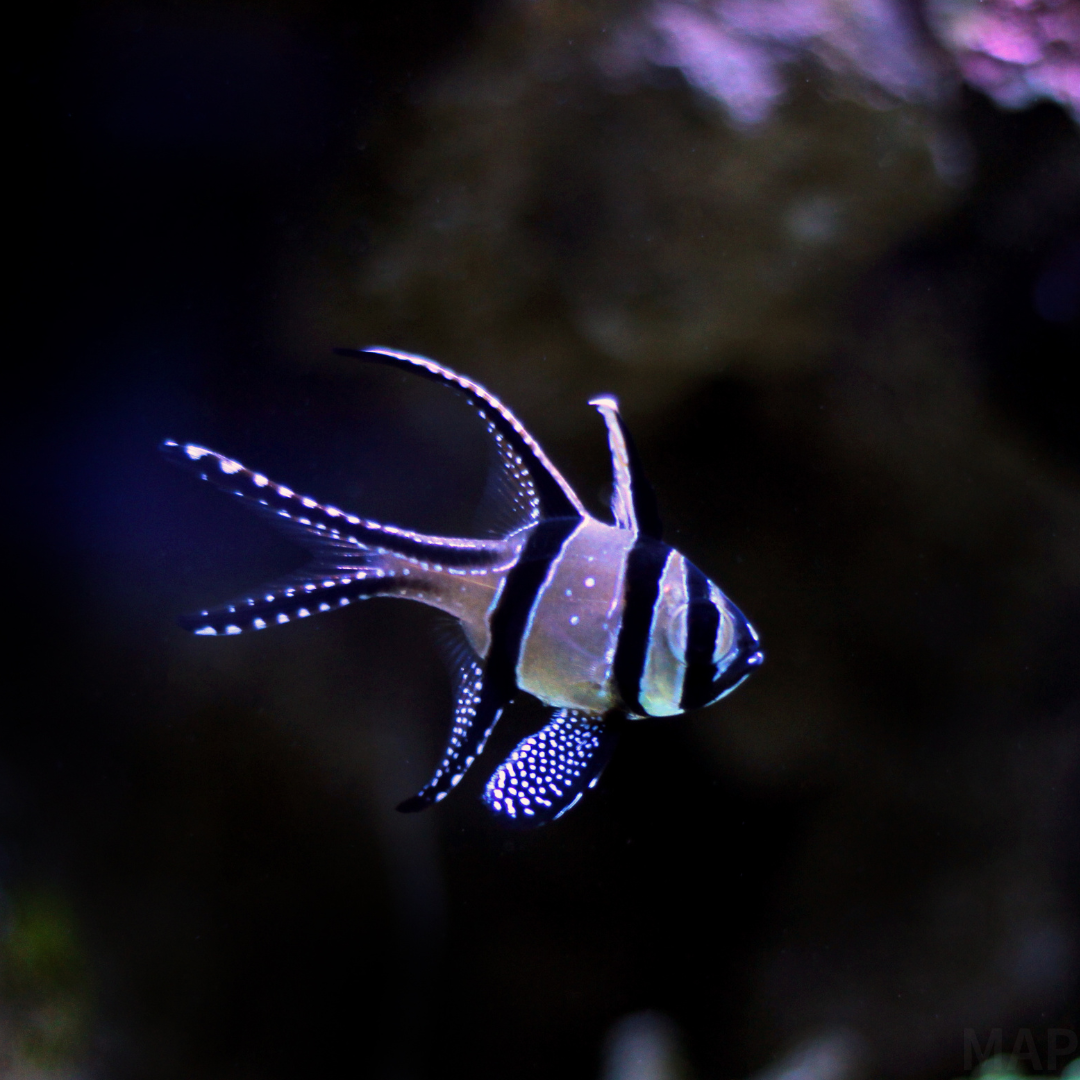プテラポゴン・カウデルニィは、銀色の体に黒い帯と星屑のような白い斑点が美しいテンジクダイ科の魚で、和名を「アマノガワテンジクダイ」と言います。非常に温和な性格と、サンゴに無害であることからサンゴ水槽で絶大な人気を誇ります。最大の特徴は、オスが口の中で卵と稚魚を育てる「口内保育(マウスブルーディング)」という繁殖行動です。しかし、その人気が原因で乱獲され、現在では絶滅危惧種に指定されています。幸いなことに飼育下での繁殖技術が確立されており、市場には丈夫な養殖個体が流通しています。 The Banggai Cardinalfish (*Pterapogon kauderni*), also known by its Japanese name “Amanogawa-tenjikudai” (Milky Way Cardinalfish), is a beautiful cardinalfish with a silver body, black bands, and starlike white spots. It is immensely popular in reef aquariums due to its very peaceful nature and reef-safe status. Its most notable characteristic is its paternal mouthbrooding behavior, where the male incubates eggs and fry in his mouth. However, its popularity led to over-collection, and it is now listed as an endangered species. Fortunately, captive breeding techniques have been established, and hardy aquacultured individuals are available in the market.