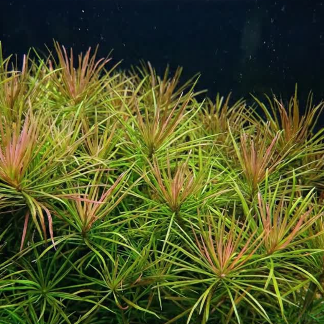 ポゴステモン ステラータ ‘ダッセン’は、その繊細かつ豪奢な草姿で多くのアクアリストを魅了するシソ科の有茎草です。かつて「オランダプラント」の名で親しまれた仲間の改良品種とされ、特に葉が細く密生し、大型の美しい樹冠(クラウン)を形成するのが特徴です。環境が良いと頂芽(成長点)付近が鮮やかなオレンジから赤紫色に染まり、下部の緑色の葉との美しいグラデーションを描きます。その美しさを最大限に引き出すには十分な光量とCO2が必要であり、水草育成の技術が試される「指標植物」としても知られています。ダッチスタイルの主役としてはもちろん、ネイチャーアクアリウムの華やかなアクセントとしても極めて人気の高い種類です。Pogostemon stellatus ‘Dassen’ is a magnificent stem plant of the Lamiaceae family that captivates aquarists with its delicate yet luxurious appearance. Considered an improved variety of the species formerly known as “Dutch Plant” (Eusteralis stellata), ‘Dassen’ is characterized by its exceptionally fine, densely growing leaves that form a large, beautiful crown. Under optimal conditions, the shoot tips turn a vibrant orange to reddish-purple, creating a stunning gradient against the green lower leaves. Bringing out its full beauty requires ample light and CO2, making it an “indicator plant” that tests an aquarist’s skills. It is extremely popular as a centerpiece in Dutch-style aquascapes and as a glamorous accent in Nature Aquariums.