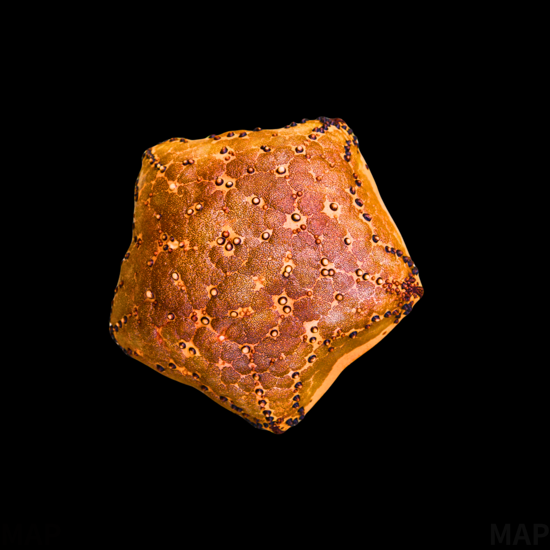 マンジュウヒトデの幼体は、実は平べったい「星型」をしています。長い間、ゴカクヒトデ科の別種だと誤解されていたほど姿が異なります。成長するにつれて腕の間が埋まり、体に水を含んで膨らむことで、私たちがよく知る「饅頭型」の成体へと劇的な変身を遂げます。この変身には2年以上かかると言われています。Juvenile Cushion Stars are actually flat and star-shaped. They look so different that they were long mistaken for a different species. As they grow, they fill in the gaps between arms and inflate with water, dramatically transforming into the “cushion” shape we know. This process takes over two years.