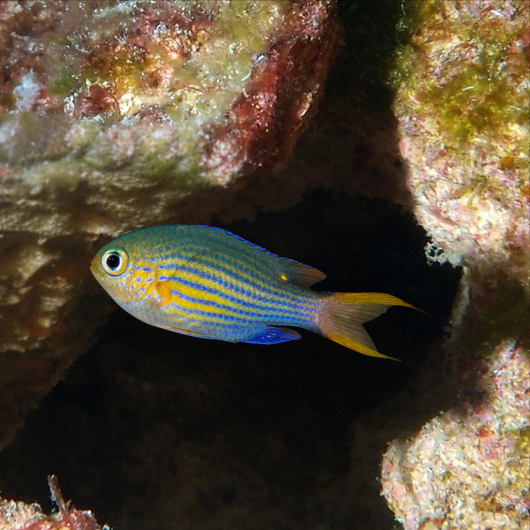 ラインドクロミス(Pycnochromis lineatus)は、その線の入った体と黄色の尾ビレが美しい、温和で飼育しやすいスズメダイです。サンゴ水槽のタンクメイトとしても最適です。The Lined Chromis (Pycnochromis lineatus) is a beautiful, peaceful, and easy-to-care-for damselfish, distinguished by its lined body and yellow tail. It is an excellent tank mate for a reef aquarium.