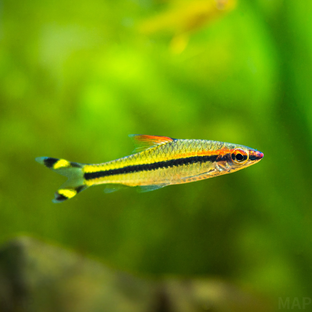 レッドライン・トーピードバルブは、インド南西部に連なる西ガーツ山脈の急流に生息する、コイ科の美しい魚です。魚雷(トーピード)を彷彿とさせる流線型の体に、吻端から体の中央まで伸びる鮮やかな赤いラインと、それを貫く黒いラインが最大の特徴です。非常に活発に泳ぎ回り、6匹以上の群れで飼育すると、一体感のあるダイナミックな群泳を見せてくれます。その美しさから世界的な人気を博し、一時は乱獲により絶滅が危惧されましたが、現在では商業的な養殖が確立され、安定して市場に供給されています。 The Redline Torpedo Barb is a beautiful cyprinid native to the fast-flowing streams of the Western Ghats in southwestern India. Its most striking features are a torpedo-shaped body, a vibrant red line running from the snout to the middle of the body, and a black line that runs through it. They are very active swimmers, and keeping them in a school of six or more allows for the observation of dynamic, coordinated shoaling behavior. Its beauty led to global popularity and once threatened it with extinction due to overfishing, but commercial breeding has now been established, ensuring a stable supply to the market.