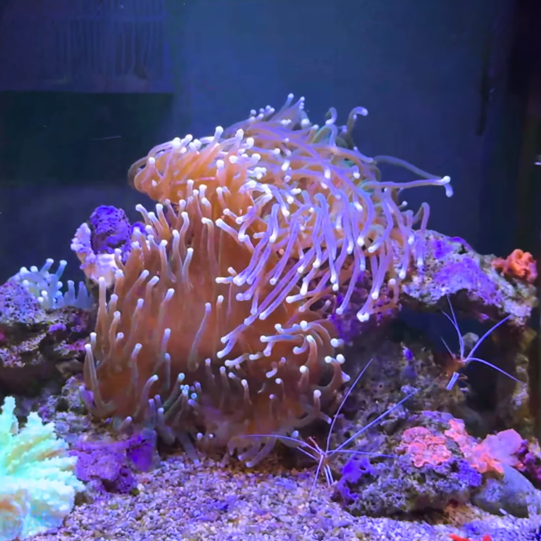 【クマノミ】自然界ではクラークズアネモネフィッシュ(A. clarkii)やピンクスカンクアネモネフィッシュ(A. perideraion)が主な宿主です。水槽内ではカクレクマノミ(A. ocellaris)なども受け入れることがありますが、共生は保証されたものではなく個体差が大きいです。【他生体】移動した際に他のサンゴやイソギンチャクに触れると、相手に深刻なダメージを与えるため、十分な距離を確保してください。素早く健康な魚は安全ですが、弱った魚や動きの遅い底生魚は捕食される可能性があります。【Clownfish】In the wild, its primary hosts are Clark’s Anemonefish (A. clarkii) and the Pink Skunk Anemonefish (A. perideraion). In aquariums, Ocellaris Clownfish (A. ocellaris) may also host, but this is not guaranteed and varies by individual. 【Other Tank Mates】Ensure ample space, as it can severely damage other corals or anemones if it moves and touches them. Healthy, fast-moving fish are generally safe, but weakened or slow-moving bottom-dwellers are at risk of being eaten.