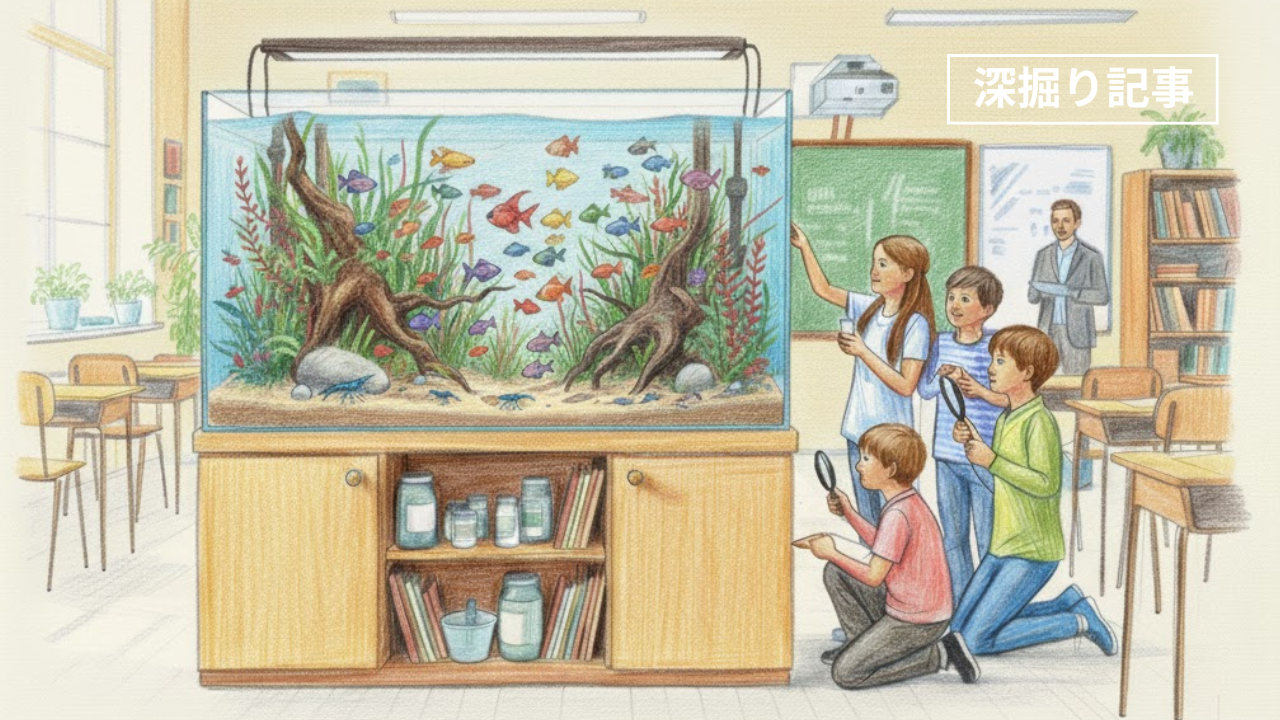水槽は、抽象的な科学概念を、生徒の目の前でリアルタイムに展開する「生きた教科書」であり、動的なミニチュア生態系モデルです。