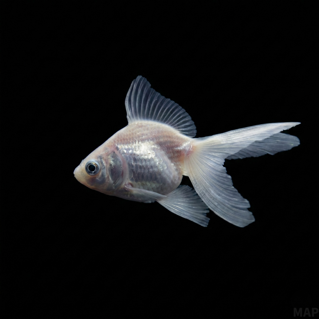 白琉金はアルビノ(色素欠損)とは異なります。アルビノが黒色素を全く作れないのに対し、白琉金は黒い目を持っています。白く見えるのは、鱗にある「グアニン」という結晶が光を反射するためです。金属的な光沢を持つ「普通鱗」と、グアニン層が欠損して陶器のように見える「透明鱗(シルク)」の2タイプが主に流通しています。White Ryukins are not Albinos. Unlike Albinos, they have black eyes. The white appearance comes from guanine crystals in the scales reflecting light. There are mainly two types: “Normal scales” with metallic shine, and “Matte/Silk scales” lacking guanine, looking like porcelain.