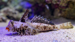 イッポンテグリについて、それはネズッポ科に属する海水魚の中でも、独立して動く腹鰭の第一棘条がまるで一本の指のように見えることからその名がついた、極めて個性的で愛嬌のある底生魚です。砂泥底を這うように移動する際の、鰭を巧みに操って歩くような独特の仕草は、他の魚類には見られない進化の過程を感じさせる興味深い特徴となっています。周囲の環境に溶け込む地味ながらも複雑な模様は、天敵の目を欺く高度な擬態としての役割を果たしており、水槽内ではその控えめながらも確かな存在感と、砂の中から大きな目だけを出して周囲を伺う愛らしい様子が、観察者に深い癒やしと知的好奇心を与えてくれます。
